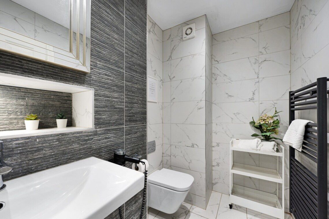 The kitchen is beautifully equipped with everything you need, from sleek appliances to generous worktops and a dining area that’s perfect for breakfast before heading out, or a late-night glass of wine when you get back. Every detail has been considered from the quality of the cookware to the way the light falls through the window in the morning.